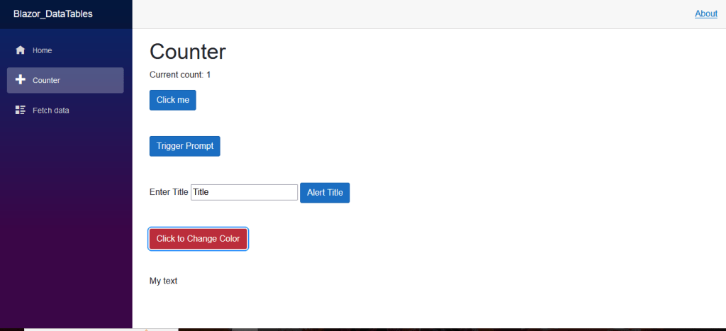 <input class="btn btn-primary" type="button" value="Alert Title" @onclick="myAlert" />