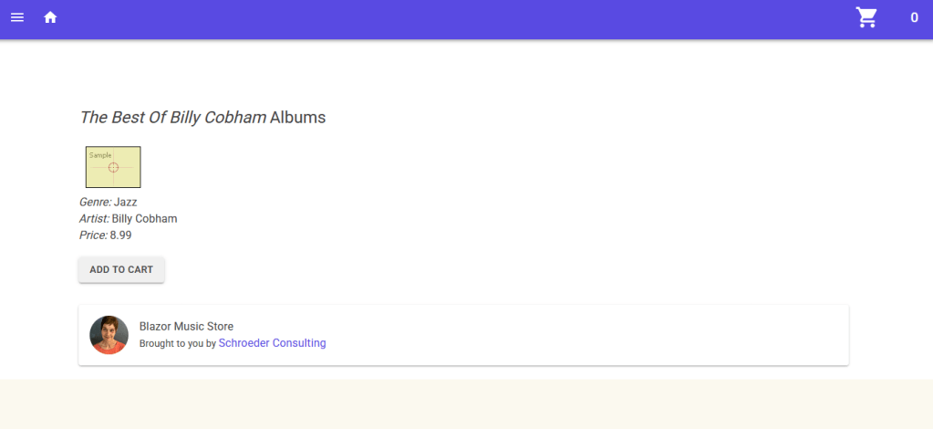 This article is part 2 of a series on a portfolio Blazor Music Store. The Blazor app uses MudBlazor. It is a recreation of the old MVC Music store. Users can browse items in the store depending of the genre they select from the side menu. Once an item is select, it can be added to a cart. Only one item can be added a one time. The logic for the cart is the same as my blog https://schroeder-consulting-llc.com/2025/06/12/update-a-component-from-a-page-in-blazor/
